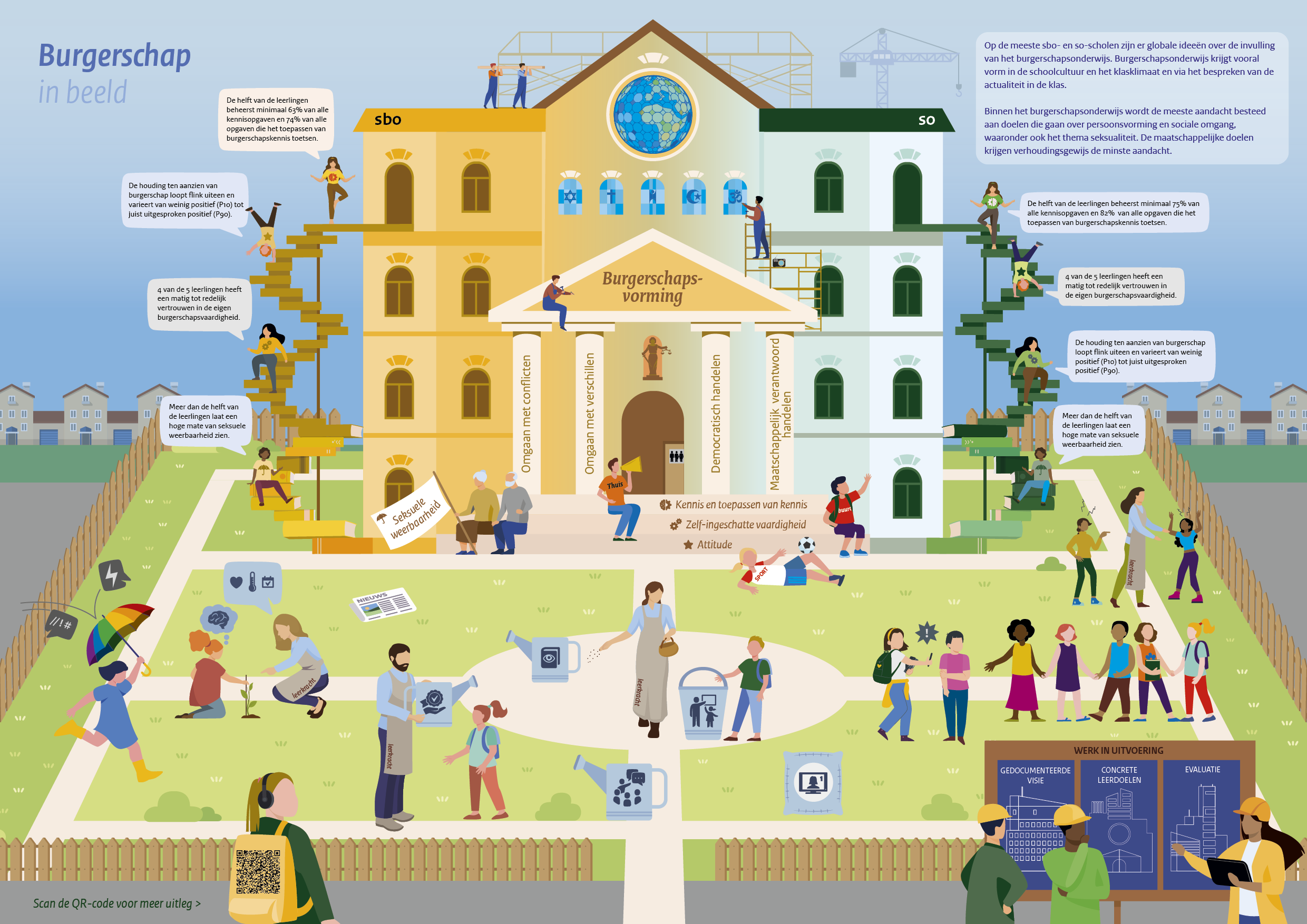 Heeft u geen tijd om alle onderzoeksresultaten te lezen of wilt u het met anderen hebben over de uitkomsten van het onderzoek naar burgerschapsonderwijs? Bekijk dan eens de praatplaat Burgerschap in beeld. De plaat laat de belangrijkste onderzoeksresultaten zien. Voor extra uitleg kunt u de bijhorende audiotour beluisteren.