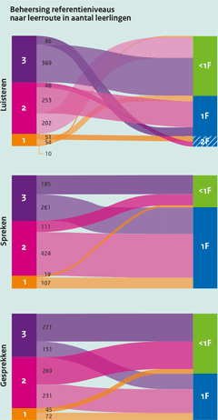 Er zijn grote verschillen tussen de luister-, spreek- en gespreksvaardigheid van leerlingen in de verschillende leerroutes. Sbo- en so-leerlingen in leerroute 1, met uitstroomprofiel vmbo-gl/tl, havo of vwo, laten met name voor luisteren (91% 1F, 44% 1S/2F) en spreken (85% 1F) beheersingsniveaus zien die dicht bij de beheersingsniveaus in het regulier basisonderwijs liggen. Ook zijn de prestaties in het so voor luisteren en spreken significant hoger dan in het sbo.