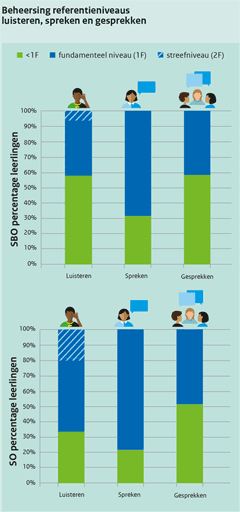 Bij de introductie van de referentieniveaus is de ambitie uitgesproken dat minimaal 85 procent van alle leerlingen aan het einde van het primair onderwijs het fundamentele niveau 1F beheerst en minimaal 65 procent het streefniveau 1S/2F. In het sbo behaalt respectievelijk 41, 68 en 41 procent van de leerlingen het fundamentele niveau 1F voor luisteren, spreken en gesprekken. In het so is dit 66, 79 en 49 procent. Het peilingsonderzoek Mondelinge taalvaardigheid in het regulier basisonderwijs liet zien dat eind groep 8 95, 92 en 87 procent van de leerlingen niveau 1F voor luisteren, spreken en gesprekken beheerst. Van de sbo-leerlingen beheerst 7 procent ook voor luisteren niveau 1S/2F en van de so-leerlingen is dit 20 procent. In het basisonderwijs is dit 40 procent.