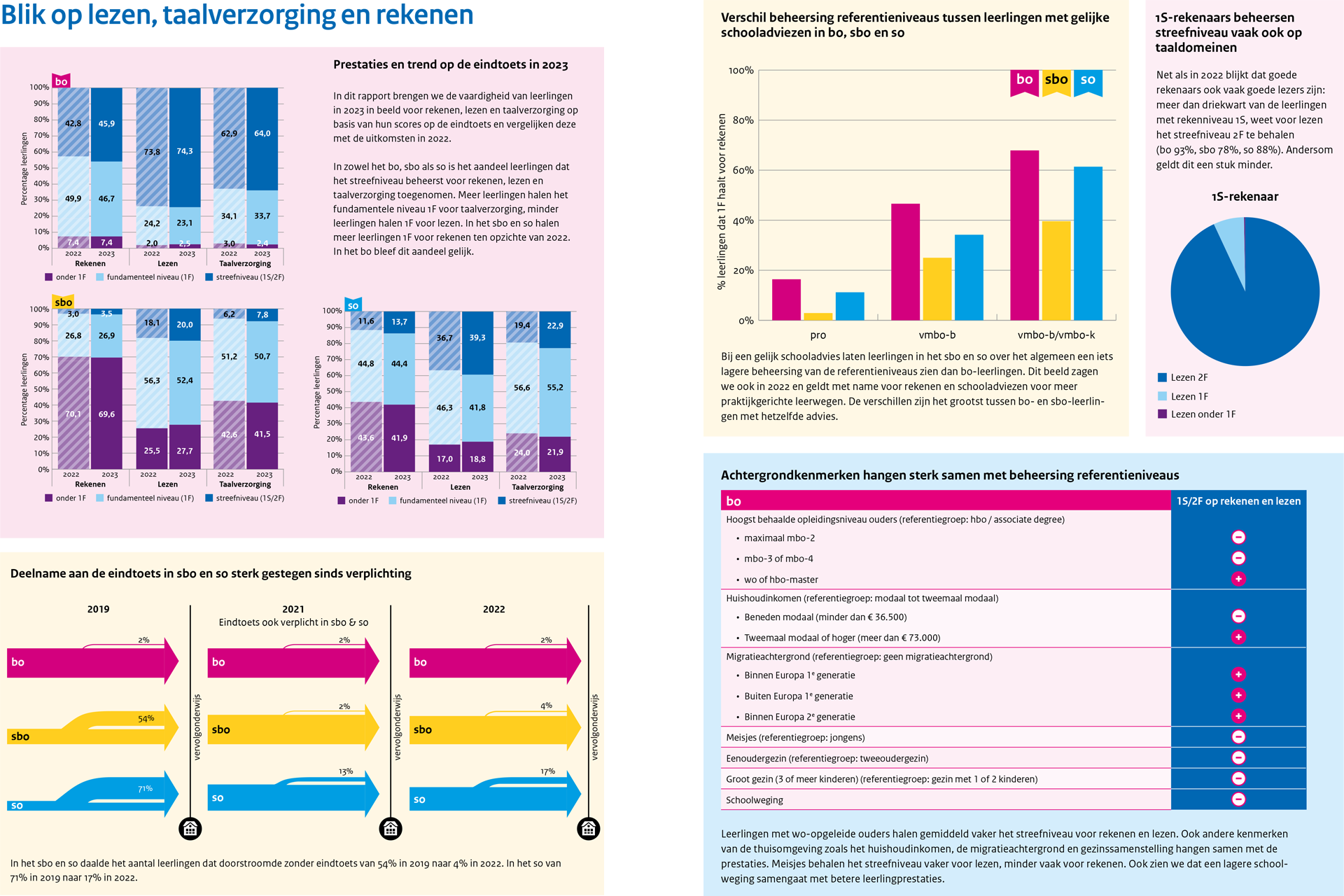 In 2023 is in zowel het bo, sbo als so het aandeel leerlingen dat het streefniveau beheerst voor rekenen, lezen en taalverzorging toegenomen. In het bo is de grootste stijging zichtbaar bij rekenen. Daar beheerst 46% 1S ten opzichte van 43% in 2022. Voor lezen is het aandeel op 2F in beide jaren 74% en voor taalverzorging steeg het aandeel op 2F van 63% naar 64%. De ambitie van 65% van de leerlingen op 1S/2F wordt in het bo dus gehaald voor lezen, maar niet voor rekenen en taalverzorging. In het sbo nam het aandeel leerlingen dat 2F beheerst vooral toe bij lezen: 20% ten opzichte van 18% in 2022. De beheersing van de streefniveaus ligt voor rekenen (van 3% naar 4%) en taalverzorging (van 6% naar 8%) een stuk lager dan voor lezen. In het so zien we de sterkste toename in de beheersing van het streefniveau voor taalverzorging: van 19% naar 23%. Voor rekenen weet 14% van de so-leerlingen het streefniveau te behalen tegenover 12% in 2022 en voor lezen 39% tegenover 37% in 2022. De ambitie van 65% van de leerlingen op het streefniveau wordt voor rekenen alleen gehaald door (s)bo-leerlingen met schooladvies havo/vwo of vwo. Voor lezen wordt deze ambitie gehaald door de (s)bo-leerlingen met het schooladvies vmbo gemengde of theoretische leerweg (vmbo-(g)t) of hoger. Voor taalverzorging lukt dit in het bo alleen de groep leerlingen met een schooladvies vmbo-(g)t of havo, of hoger en in het sbo alleen de groep met een schooladvies havo of hoger.