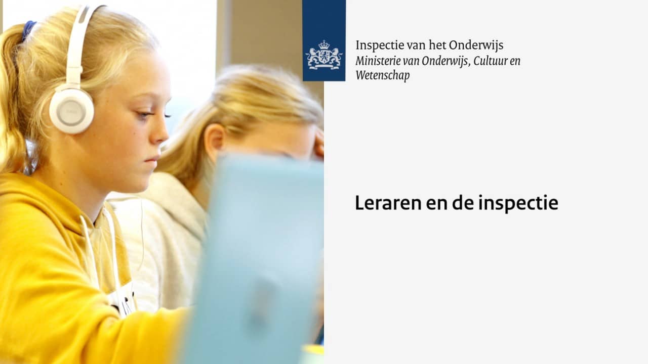 (Het Nederlandse wapenschild met daarnaast: Inspectie van het Onderwijs. Ministerie van Onderwijs, Cultuur en Wetenschap. Beeldtitel: Leraren en de inspectie. Voice-over:)